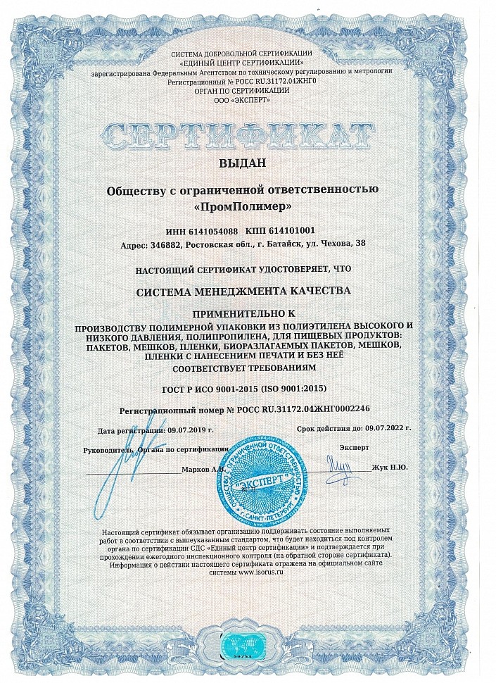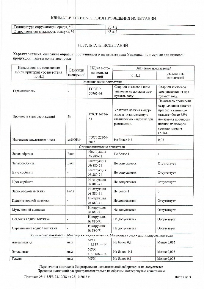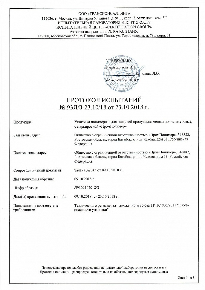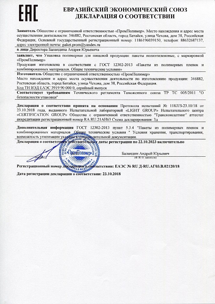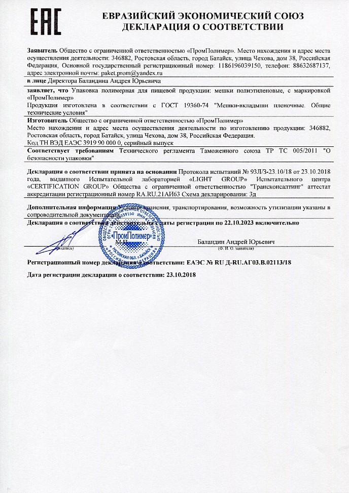 Декларация о соответствии: пакеты полиэтиленовые с протоколом испытаний